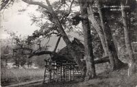 Camino del santuaro de Mishayama, Shinshū Estructura de madera sostenida por pilares, construida junto a un árbol de gran tamaño; inscripción japonesa impresa.