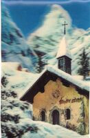 Postal nevada Capilla alpina cubierta de nieve, con montañas al fondo.