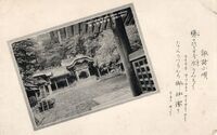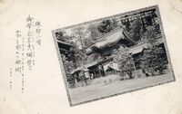 Postal Cancion de Suwa 4 Vista frontal de templo sintoísta, con inscripción japonesa impresa y texto manuscrito.