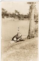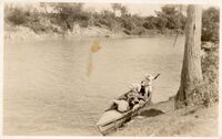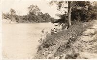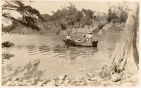 Rio Valles 1 Orilla de río con árboles; dos personas se observan sentadas en una pequeña embarcación.