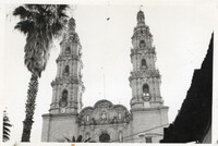 Basilica de San Juan de los Lagos Vista frontal de la basilica de San Juan de los Lagos con dos torres altas, captado desde ángulo bajo; palmera al lado izquierdo.