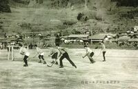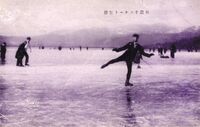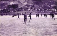 Hokey sobre hielo en el lago Suwa Grupo de hombres jugando hockey sobre hielo, con casas y montañas al fondo; texto en japonés en la parte inferior.