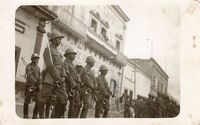 Pelotón del ejercito Fila de soldados con cascos y fusiles, formados en calle con edificios coloniales.