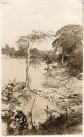 Rio Valles 6 Árbol inclinado sobre la orilla de un cuerpo de agua; vegetación densa al fondo.