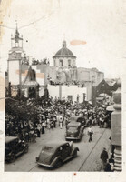 Plaza principal de Cerritos, S.L.P. Multitud reunida frente a un templo católico durante un evento público; automóviles antiguos en primer plano.