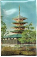 Pagoda del templo Daiju-ji, Okazaki Pagoda japonesa de varios niveles rodeada de árboles, en impresión a color.