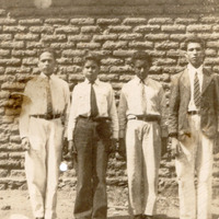 Cuatro varones, probablemente egresados de la primaria, posan frente a un muro de adobe