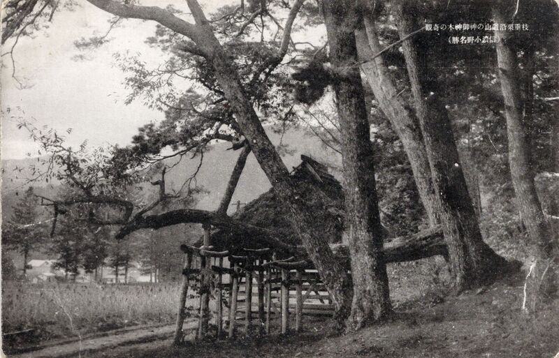 Inscripcion en el anverso: “Árbol de aspecto singular, a lo largo del camino del santuario de Mishayama (Pequeñas vistas célebres de Shinshū).” (traduccion ChatGPT)