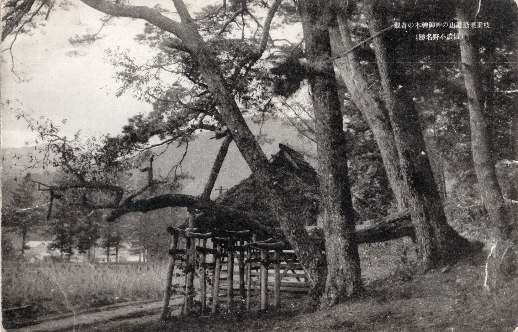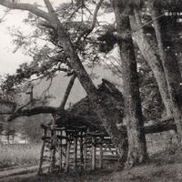 Estructura de madera sostenida por pilares, construida junto a un árbol de gran tamaño; inscripción japonesa impresa.
