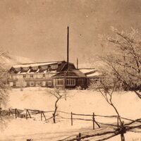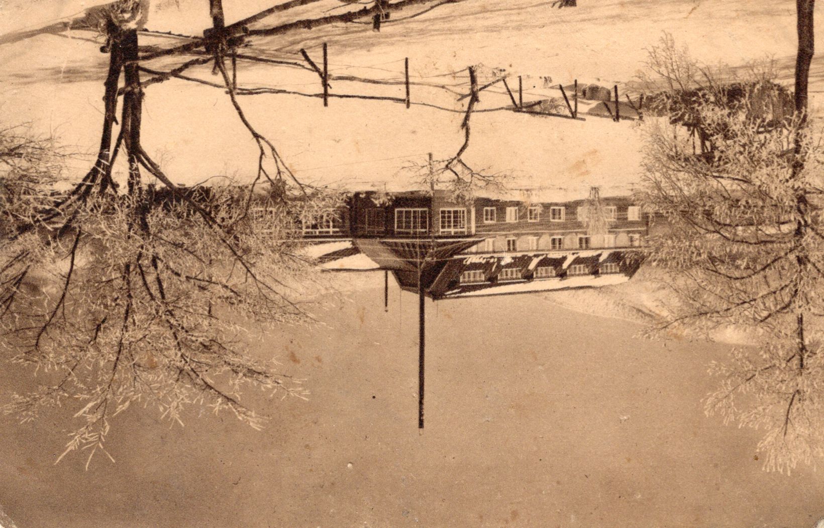 Paisaje invernal con casa y ramas nevadas; impreso en tono sepia.