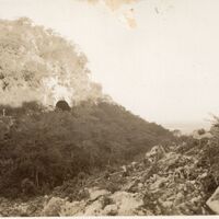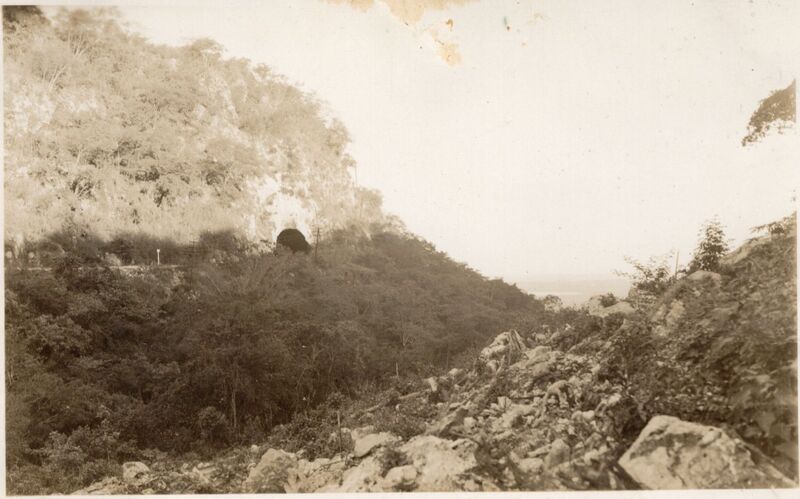 Paisaje natural con colinas y un túnel visible entre la vegetación.