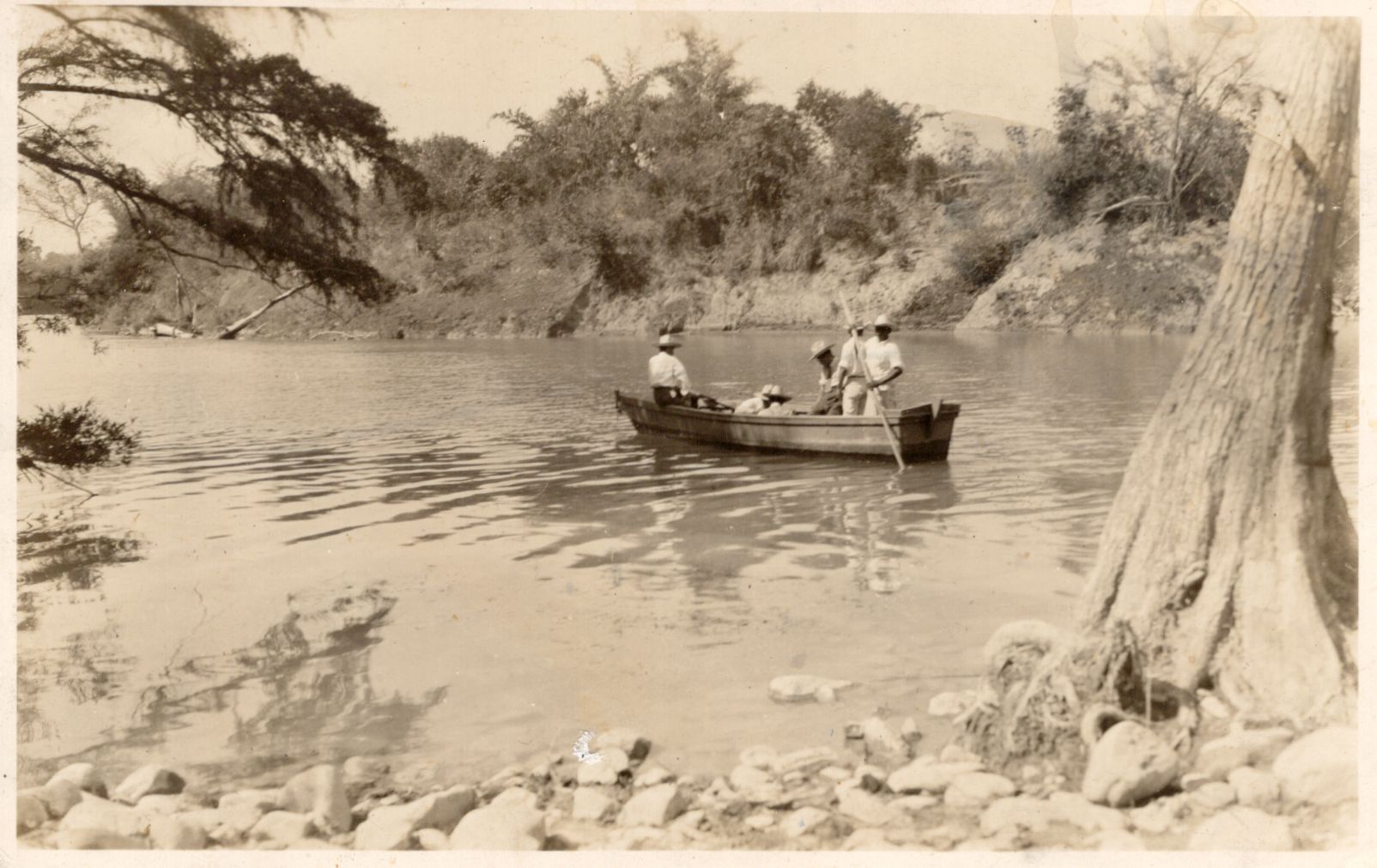 Seis personas a bordo de una lancha en un río rodeado de vegetación.