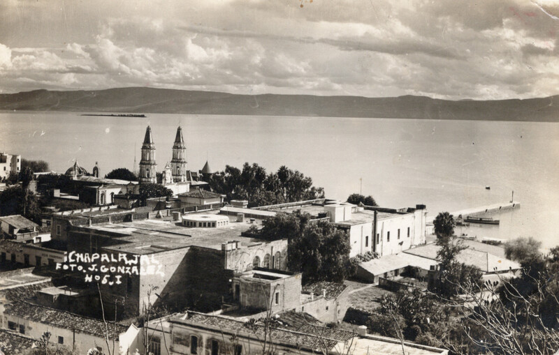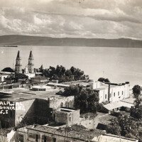 Panorámica de Chapala con iglesia y lago al fondo, tomada desde una posición elevada.