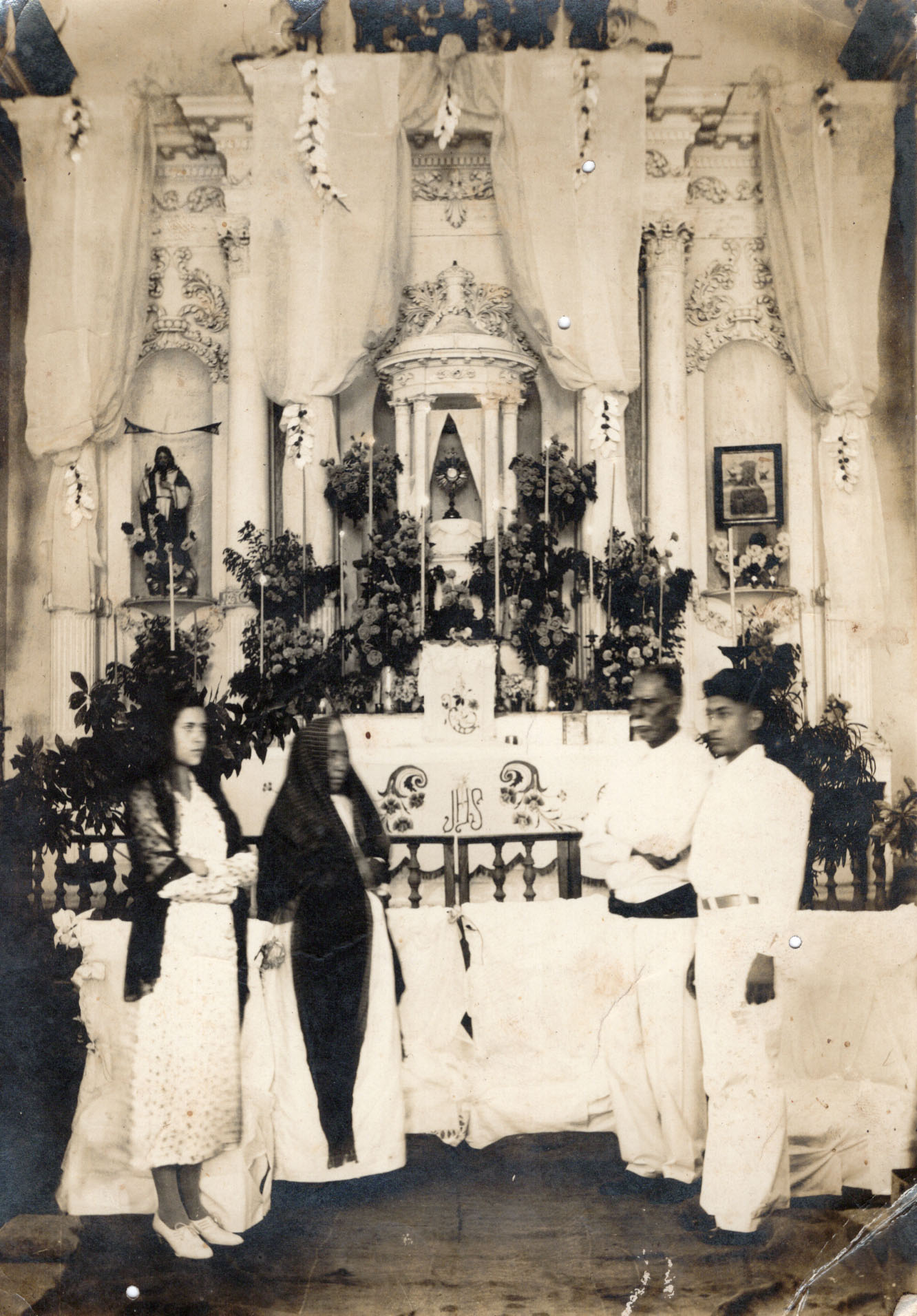 Candido Rodriguez y Mauricia Alvarez, en la parte interior del grupo, acompañados por sus nietos Rosa Alvarez y Alejandro Corona, que fueron los padrinos de la celebración de sus bodas de oro. El grupo esta parado frente al altar de la capilla de la hacienda de Coatlancillo, obra de Hilario Alvarez, padre de Rosa y colector de esta foto.