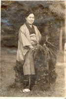Mujer japonesa no identificada con kimono en foto en exterior -