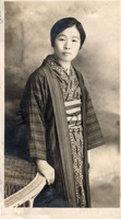 Mujer japonesa no identificada con kimono y haori en foto de estudio -